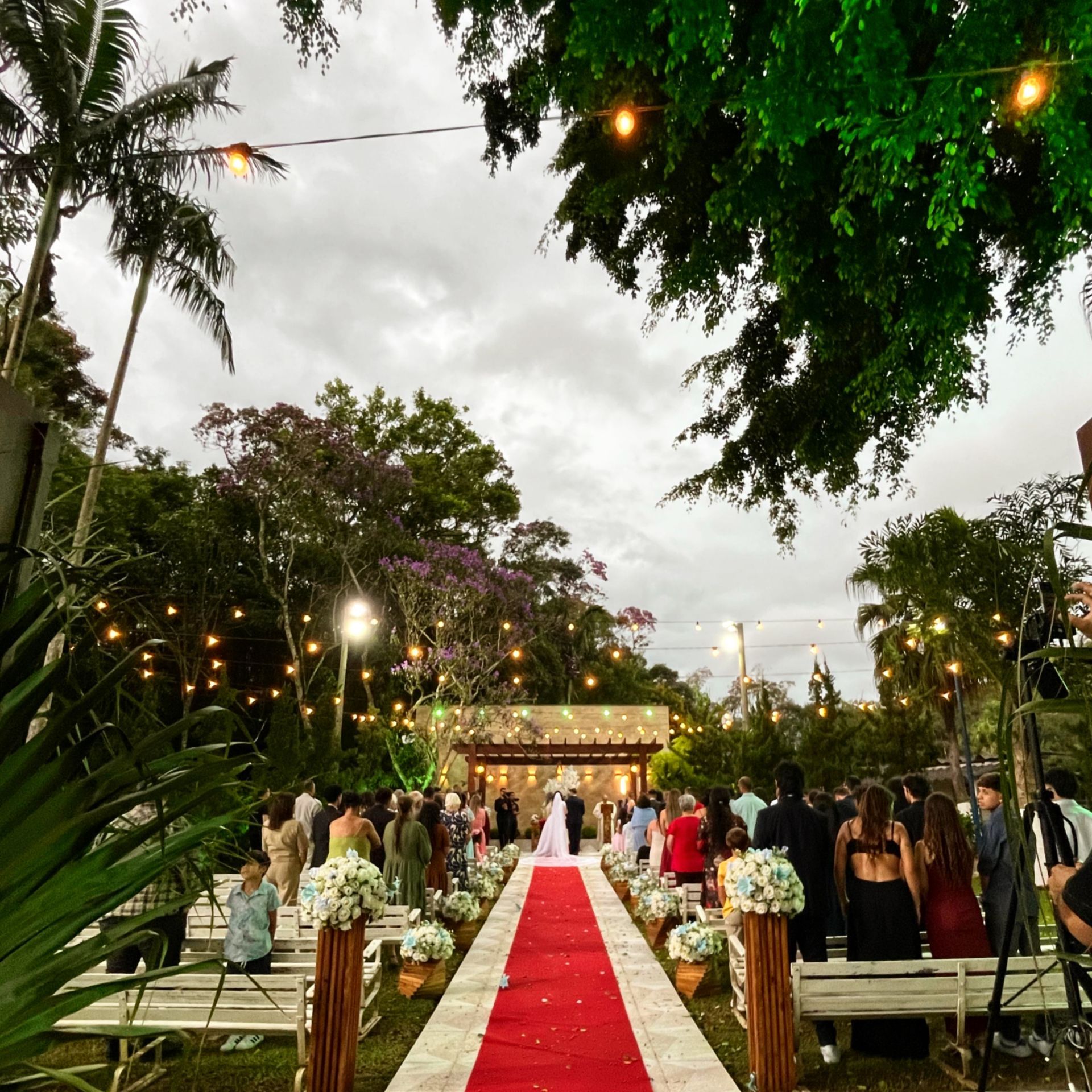 Equipamento de som profissional para cerimônia ao ar livre, proporcionando um áudio com qualidade de ambiente interno.